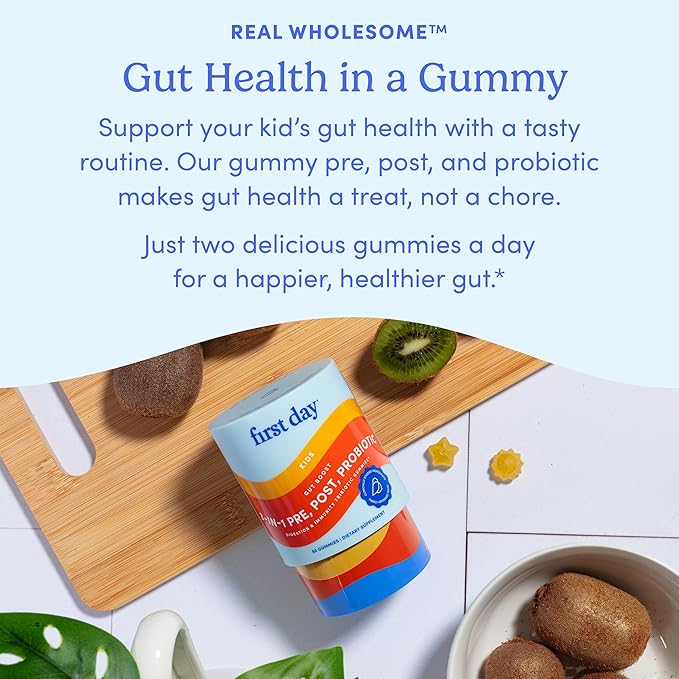 FIRST DAY Kids 3-in-1 Probiotic Gummies – Prebiotic + Probiotic + Postbiotic Supplement – Supports Digestive & Oral Health, Immune Function & Energy Levels – 30-Day Supply