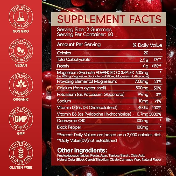 - 0 SUGAR VEGAN FRIENDLY: Natural Magnesium Glycinate Gummies are blended with the unique taste of Cherry, are free of magnesium gummy and gluten, and the vegetarian-friendly gummies allow you to enjoy a pleasant experience when taking your daily supplement.