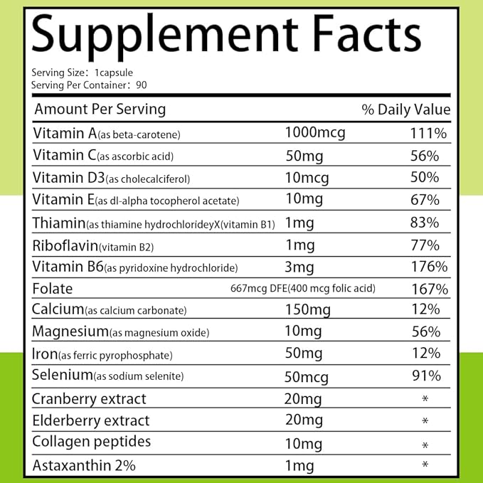 - Comprehensive Nutritional Support: This multivitamin supplement for women contains vitamins A, C, D, E, B1, B2, B6, and folic acid, as well as a variety of minerals, designed to fully support women's health needs. Vitamin A contributes to healthy skin, vitamin C boosts immunity, vitamin E is a powerful antioxidant, and B vitamins support energy metabolism and nervous system health.