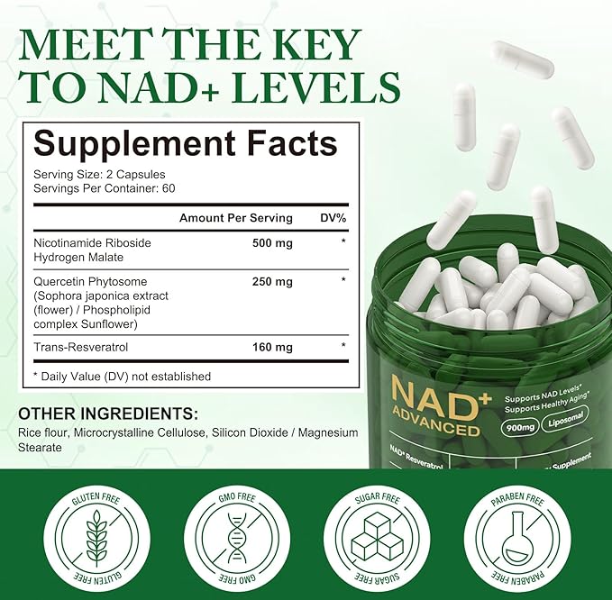 - Energy Support: Taking our Liposomal NAD, Nicotinamide Riboside, Resveratrol, and capsules daily effectively helps increase NAD levels, which contributes to healthy skin, extended aging, energy production, and is essential for your daily life