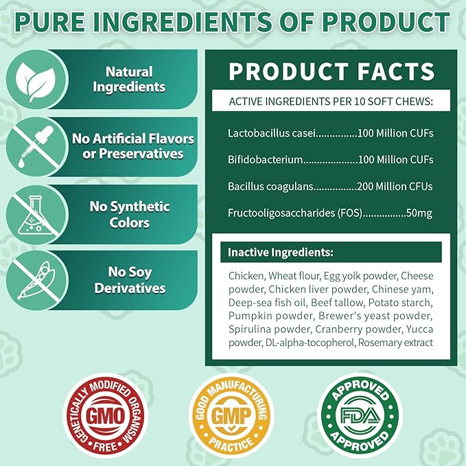 - Multi-Strain Probiotics for Gut Balance - Each cat probiotics chew provides with Bacillus subtilis, Lactobacillus acidophilus, L. plantarum, and Bifidobacterium animalis to help restore gut flora, relieve occasional constipation, and improve digestive tract function and stool quality.