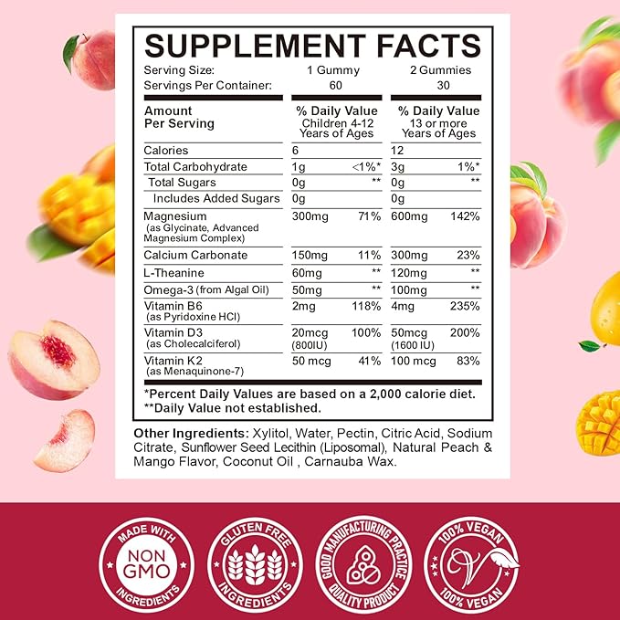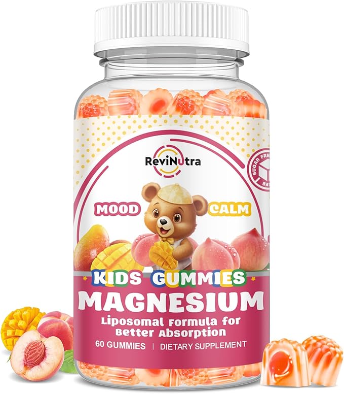 Liposomal Kids Magnesium Gummies- Magnesium Glycinate Gummies for Kids Supplement-w/Omega-3, Vitamin B6, D3- Support Calm Stress Relief, Bones, Mood, Peach & Mango Flavor, 60 Count