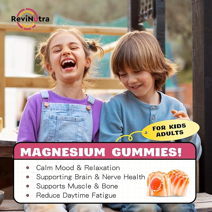 - PREMIUM MULTIVITAMIN SUPPORT: ReviNutra's magnesium gummies for kids include Vitamin D3, Vitamin K2, and Vitamin B6, which enhance magnesium and calcium absorption rates. We've also enriched our magnesium gummies with algae-derived Omega-3 to support children's brain and nerve development, vision health, and immune system strength