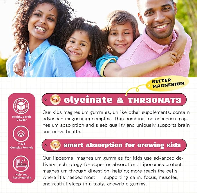 - THE IMPORTANCE OF MAGNESIUM: Magnesium is a vital mineral with over 300 health benefits. Our formula combines magnesium glycinate to promote brain health, stress relief, and improved sleep quality without the risk of drowsiness or diarrhea. Experience superior absorption and maximum benefits with our advanced magnesium blend designed to meet your child's needs