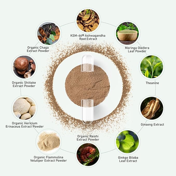 - Natural Immune Support with Organic Mushrooms - A potent blend of Reishi, Shiitake, Lion’s Mane, and Chaga (10% polysaccharides) helps nourish immune health, provides antioxidant benefits, and supports gut wellness
