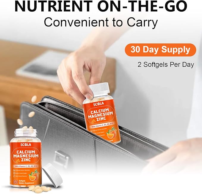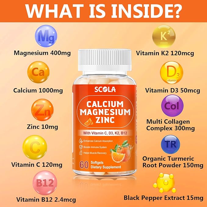 Calcium Magnesium Zinc Supplement with Vitamin C D3 B12 K2, 1000mg Calcium, 400mg Magnesium for Immune Energy Support, Bone Health and Muscle Function Softgels, 240 Count