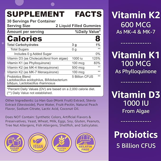 - Delicious Liquid-Filled Vitamin K Gummies, Pure Flavor – Featuring advanced GummieJel technology, these Full-Spectrum Vitamin K2 gummies have a liquid center that preserves the potency of MK-4 and MK-7. The pectin shell keeps key nutrients stable, and they are naturally sweetened with monk fruit. These sugar-free peach-flavored liquid-filled gummies make it easy to enjoy a tasty daily dose of Vitamin K.