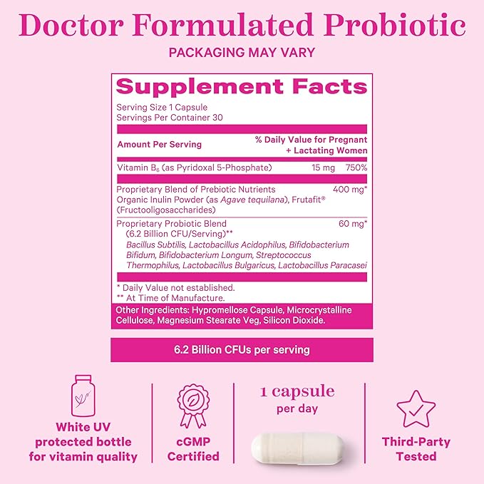 - Does your prenatal supplement ritual start and end with a prenatal vitamin? Pink Stork Prenatal Probiotic is formulated JUST for pregnant women with Vitamin B6, Inulin Prebiotic Fiber, and SEVEN spore-based probiotic strains to target prenatal needs - specifically digestive wellness (which impacts morning sickness!), constipation, and hormone support. Take one small capsule daily with your Pink Stork Prenatal Vitamins.