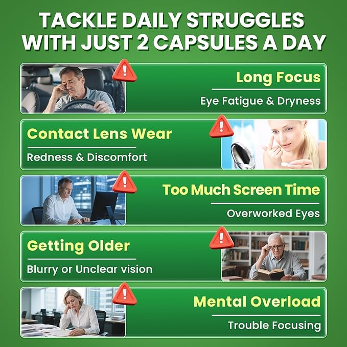 - Visual Comfort & Focus Support: Infused with ginkgo biloba, phosphatidylserine, l-theanine, and CoQ10 to enhance cognition, mental clarity, focus, and memory. Encourages mental relaxation and eases discomfort from visual overload