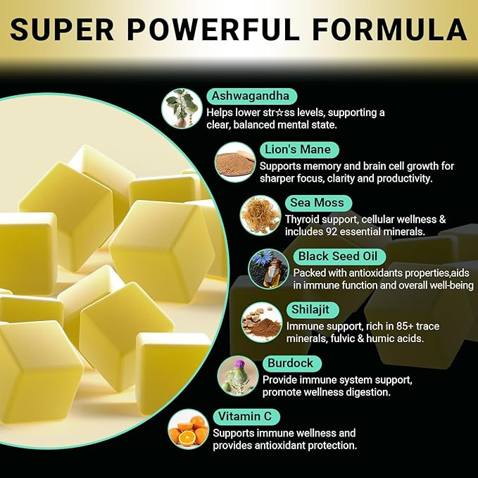 - Formula Content - This ashwagandha gummies supplement formula of 6 natural ingredients including himalayan shilajit, ashwagandha, lions mane, sea moss, black seed oil, and burdock in convenient gummy form.