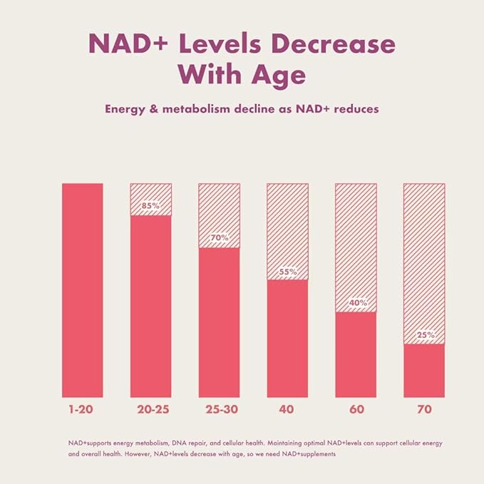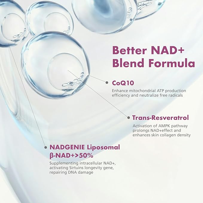 - NAD+ for Maximum Absorption:Our advanced liposomal delivery enhances the bioavailability of NAD+, helping your body absorb this key coenzyme efficiently for daily cellular energy support