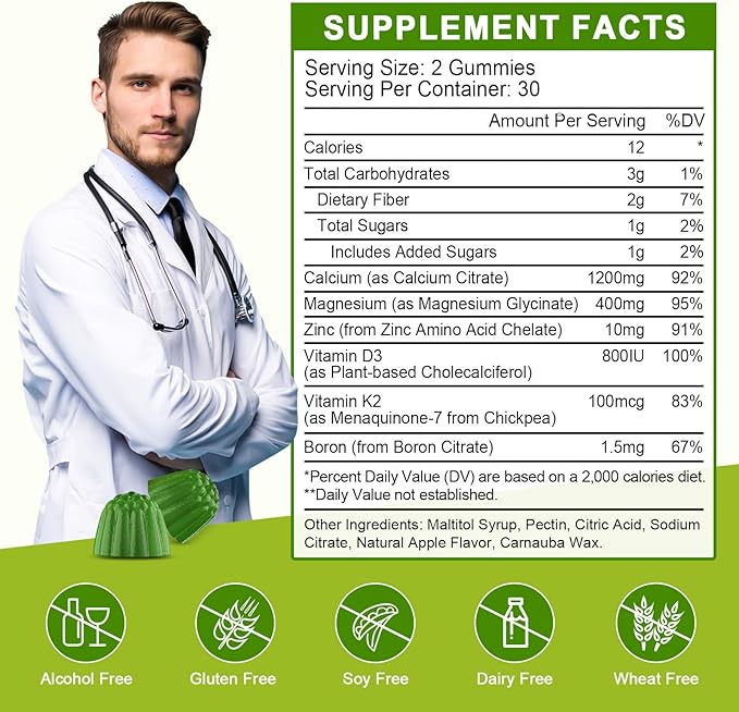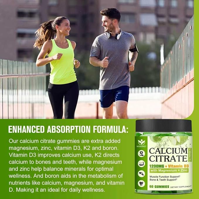 - Bone & Immune Support Together: WOGORGT calcium citrate gummies are contain calcium citrate 1200mg, magnesium glycinate 400mg, zinc 10mg, 800 IU vitamin D3, 100mcg vitamin K3 and 1.5mg boron, contribute to supports bone density, strong teeth, and efficient calcium absorption.