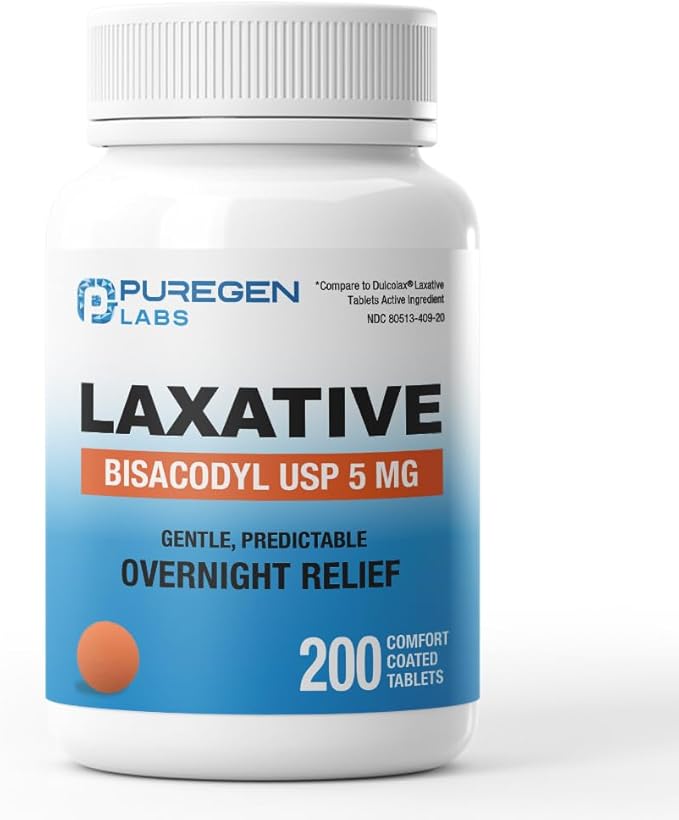 Puregen Labs Bisacodyl 5mg Tablet | 200 Count | Stimulant Laxative, Gentle and Fast Overnight Relief for Constipation