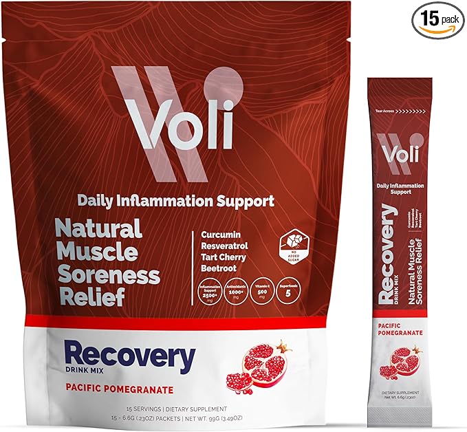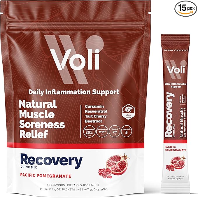 Voli Recovery - Post Workout Superfood Powder | Plant-Based Drink Mix Packets with Curcumin, Ginger & Vitamin C for Muscle Recovery & Immune Support, Inflammation & Leg Cramps Support, Vegan, 15 Count