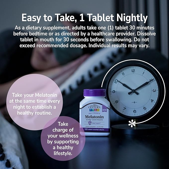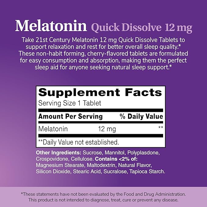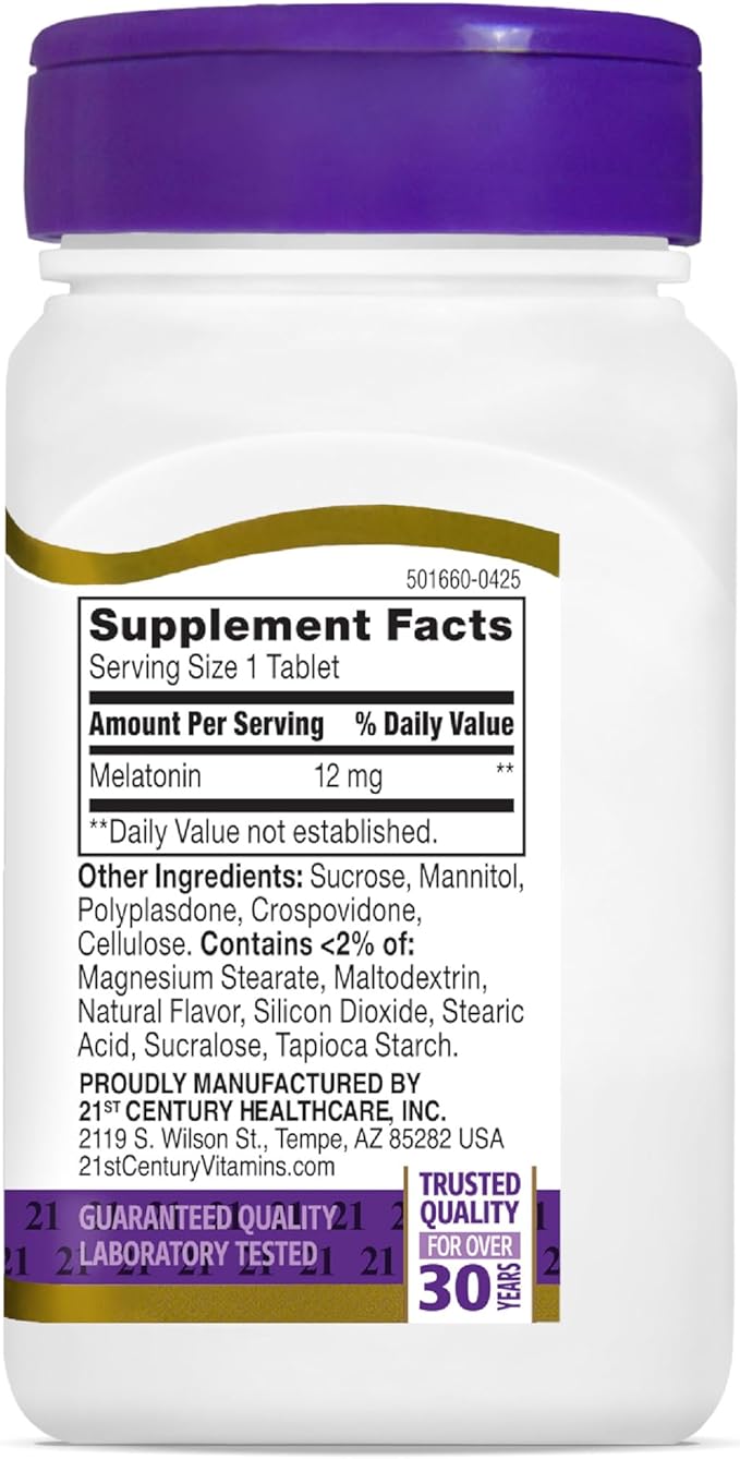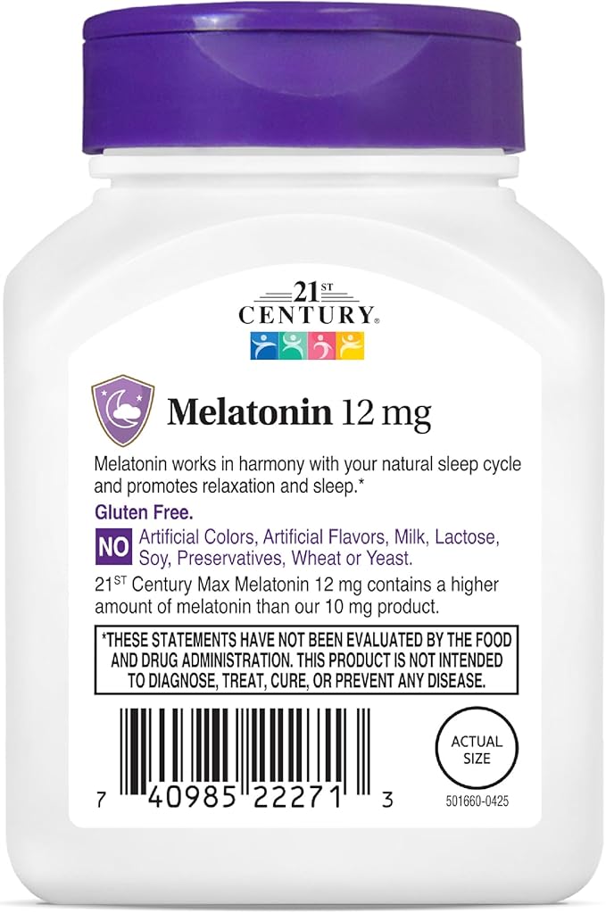 - MAX STRENGTH SLEEP AID: Melatonin helps maintain our sleep/wake cycles, playing a crucial role in promoting restful sleep.* 21st Century Melatonin 12 mg helps individuals with occasional sleeplessness to fall asleep faster & enjoy more restful sleep*