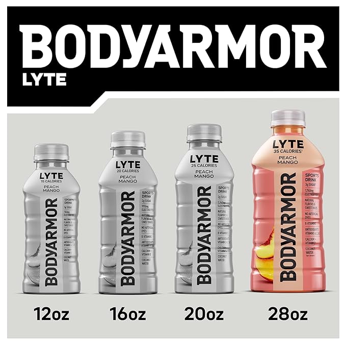 - 15 pack, 28 fl oz bottle of BODYARMOR Lyte Peach Mango electrolyte drink for hydration that keeps pace with your active lifestyle