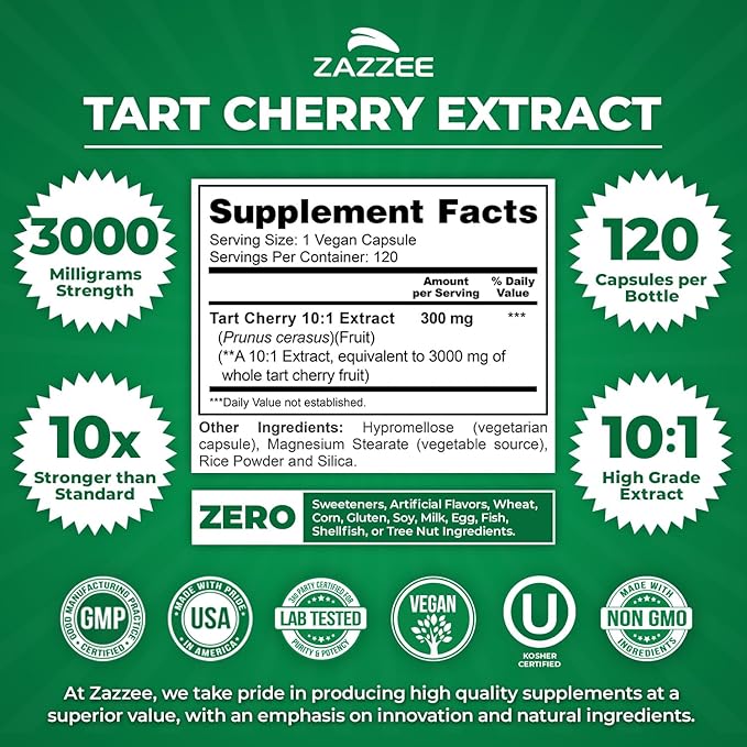Zazzee Tart Cherry 10:1 Extract, 3000 mg Strength, 120 Vegan Capsules, 4 Month Supply, Certified Kosher, Concentrated and Standardized 10X Extract, 100% Vegetarian, All-Natural, Gluten Free, Non-GMO