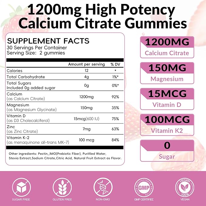 Calcium Citrate Gummies 1200mg with Magnesium,Vitamin D3, K2, Calcium Supplements for Women & Men- Easy to Digest, Vegan, Gluten Free,Sugar Free- Strawberry Flavor, 60 Calcium Gummies