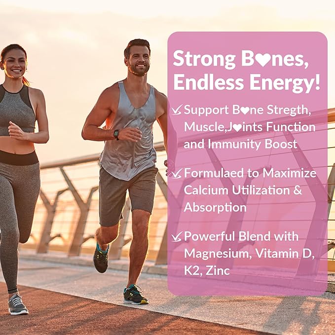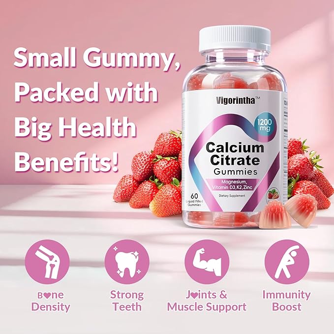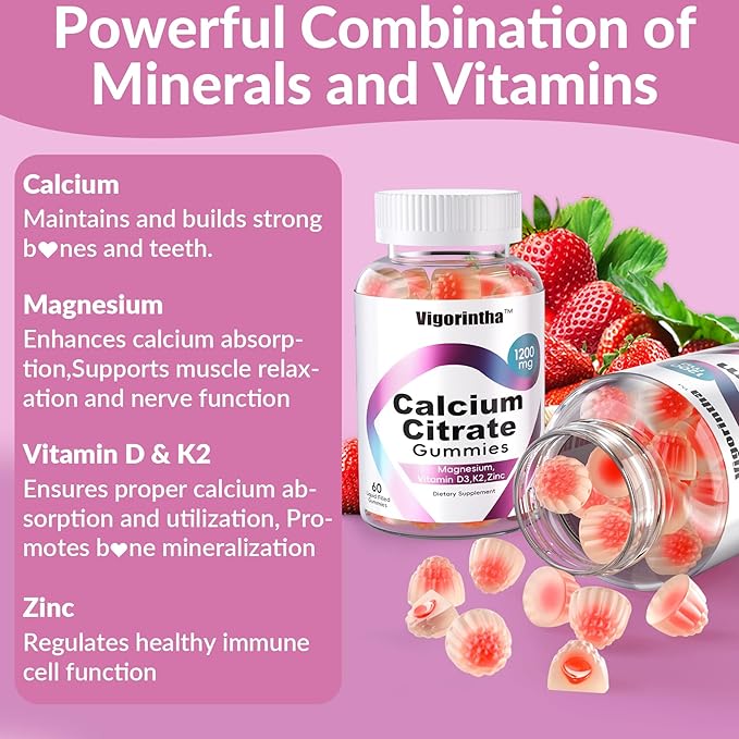 - [High-Absorption Calcium] Each calcium gummy delivers 1200mg of chelated calcium citrate, a highly bioavailable and stomach-friendly form to maximize calcium intake without digestive discomfort. Meet your daily calcium needs with ease and enjoy superior absorption—no more bulky supplements!