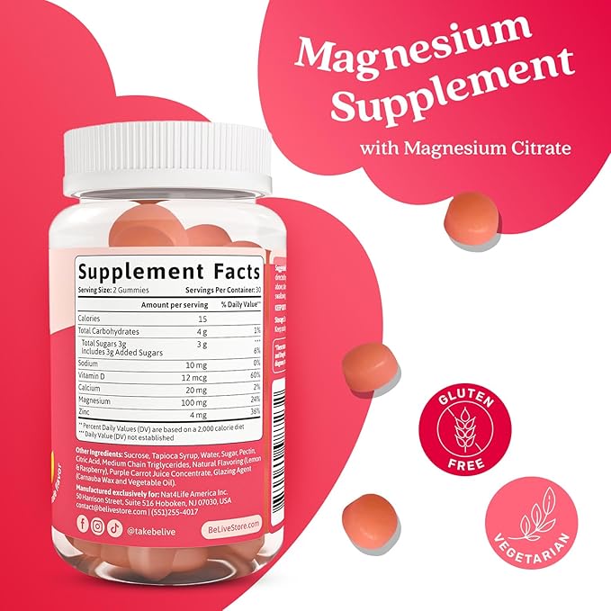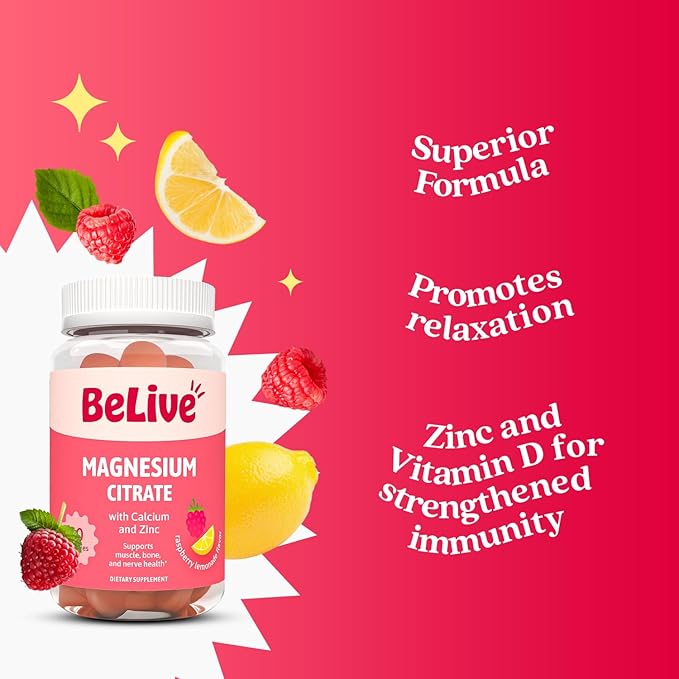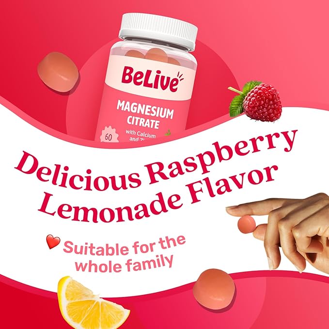 BeLive Magnesium Citrate Gummies with Calcium and Zinc for Adults and Kids - High Absorption Magnesium Supplement for Cognitive, Bone, Muscle and Nerve Health - Raspberry Lemonade - 60 Count