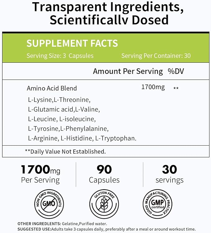 - 【COMPLETE AMINO ACID FORMULA】Vicwell Amino Acid features a comprehensive blend of 11 amino acids, including branched-chain amino acids (BCAAs) and essential amino acids (EAAs), to support your daily nutritional needs. Each serving delivers 1700mg of premium amino acids in convenient, easy-to-swallow capsules—an efficient way to fuel your active lifestyle.*