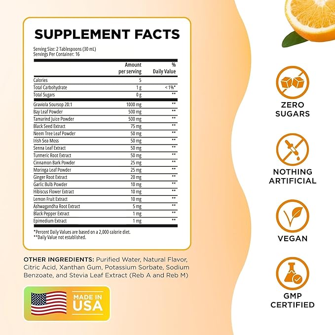 Soursop Bitters Liquid with Soursop Leaves for Gut Cleanse, Detox & Immune Boost with Black Seed, Moringa, Irish Moss, Ashwaganda, Turmeric, 16 fl oz (16 Fl Oz, Orange)