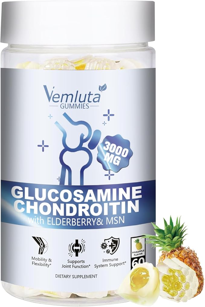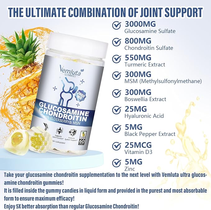 - 【 Delicious Liquid-Filled Glucosamine Chondroitin Gummies 】: Take your glucosamine chondroitin to a new level with Vemluta Superglucosamine Chondroitin Gummies! Powered by innovative gel technology, the active ingredients are encapsulated in pectin to protect them from degradation. It is filled in the gummy candies in liquid form and provided in the purest and most easily absorbed form to ensure maximum efficacy. Enjoy 5 times better absorption than ordinary glucosamine chondroitin! With a natural pineapple flavor, these gummy candies are easier - and more delicious - to nourish your body.
