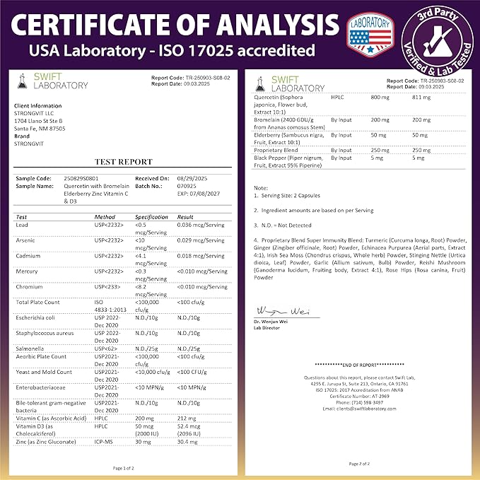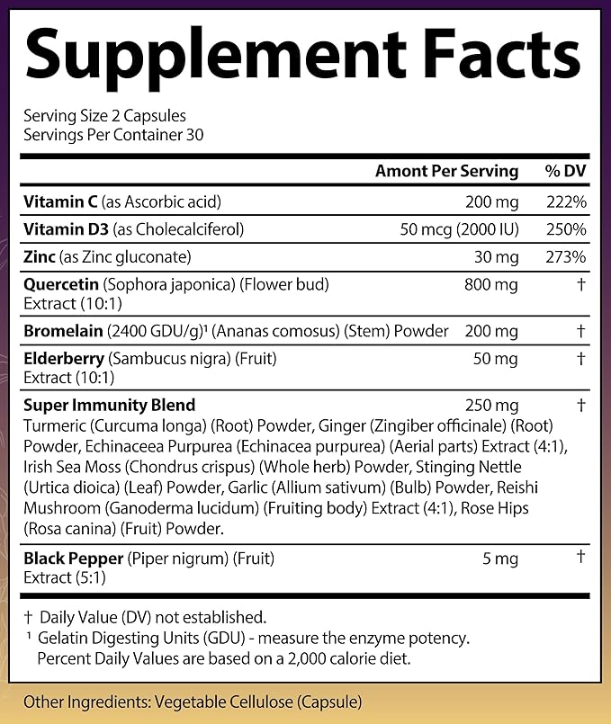 - Primary Supplement Type : Quercetin, Bromelain, Zinc, Vitamin C, Vitamin D3, Elderberry, Black Pepper