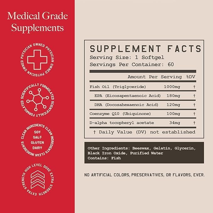 - HIGH POTENCY FOR HEART HEALTH: Delivers 1000 mg omega 3, 100 mg coq10, and 34 mg vitamin e per serving. Sourced from wild caught fish oil for optimal omega 3 and coenzyme q10 benefits.