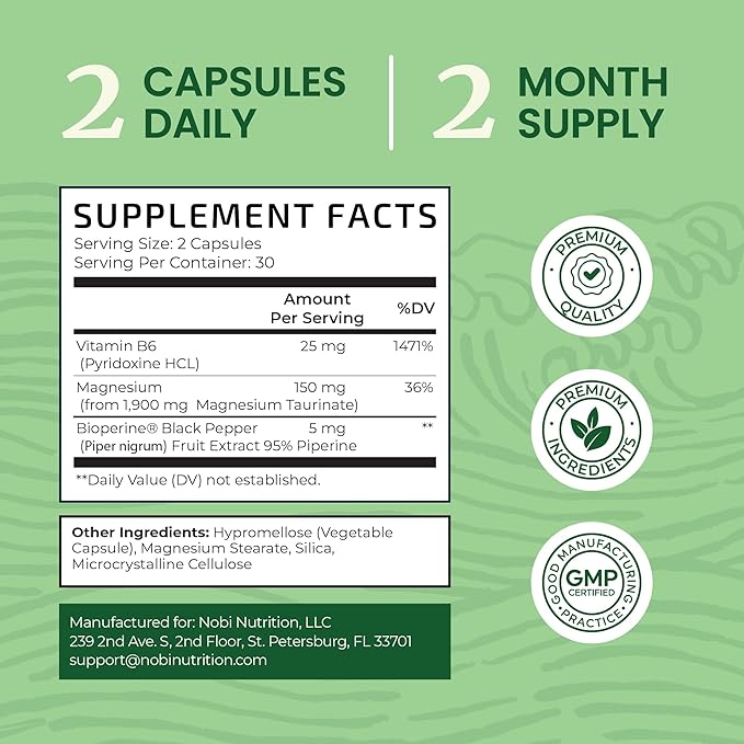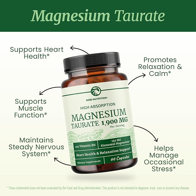 - TRUSTED QUALITY: Nobi Nutrition’s trusted Magnesium Taurate supplements are formulated with premium ingredients, to meet the highest standards of quality and effectiveness, and manufactured in a facility that adheres to GMP guidelines.