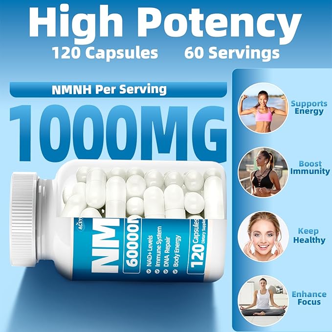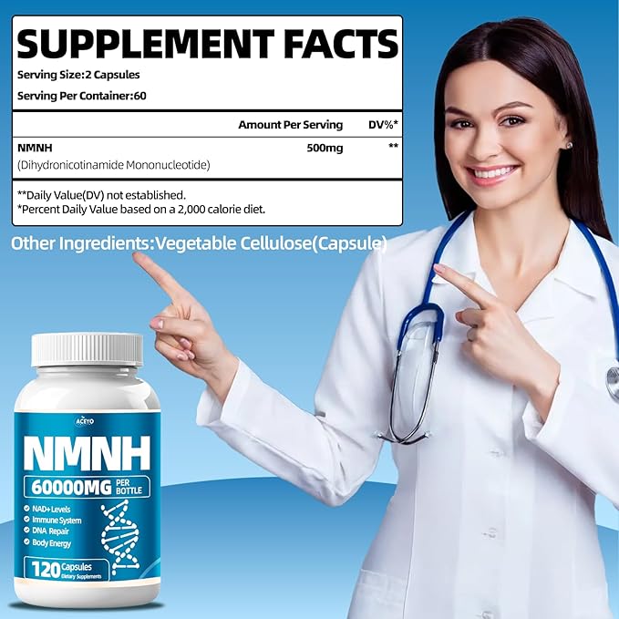 - Usage Instructions:Adults should take 2 NMNH capsules daily. Each capsule is 500mg. Each bottle contains 120 NMNH capsules, providing you with 60 servings.Please note: Store the capsules in a room at room temperature, away from direct sunlight.