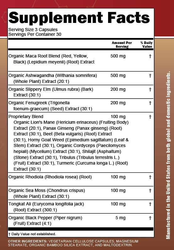 - Premium Maca Root Extract for Daily Balance. Each serving contains 500 mg of Organic Maca Root (Red, Yellow & Black) extract. Sourced with care, this adaptogenic root is a key component of Clean Nutra’s AdaptaCore formula, delivering reliable quality and consistency in every capsule.