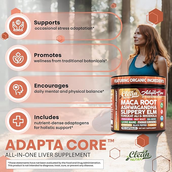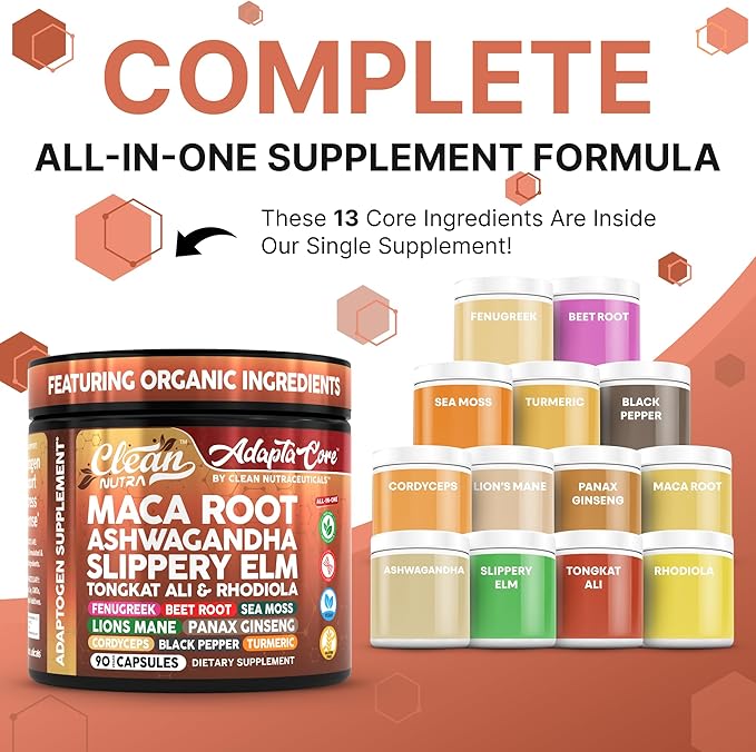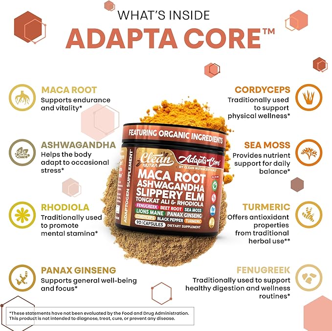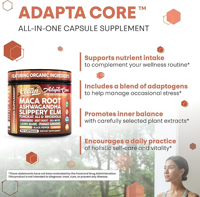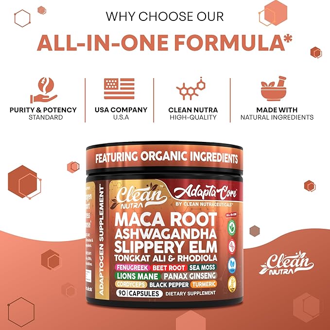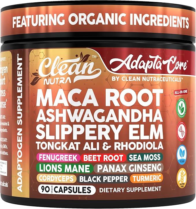 Clean Nutra AdaptaCore, Organic Maca Root Complex with Ashwagandha, Slippery Elm, Fenugreek, 90 Vegan Capsules