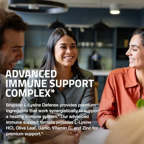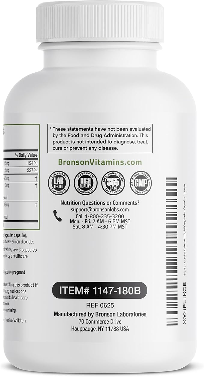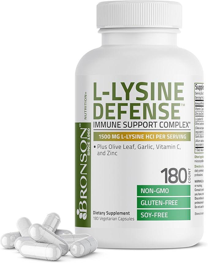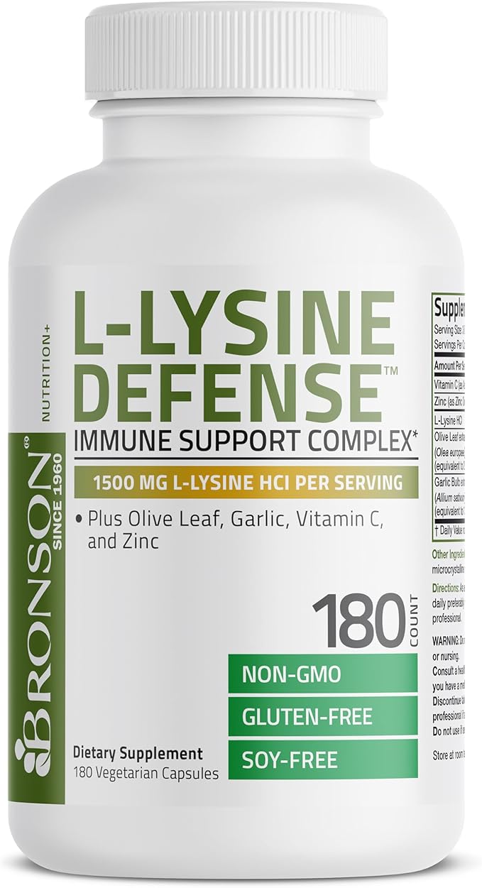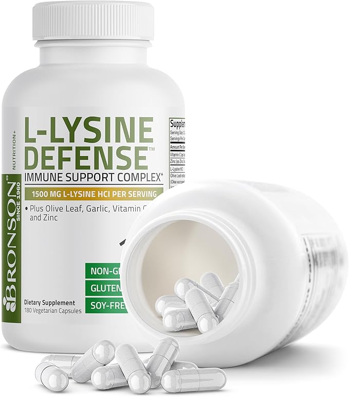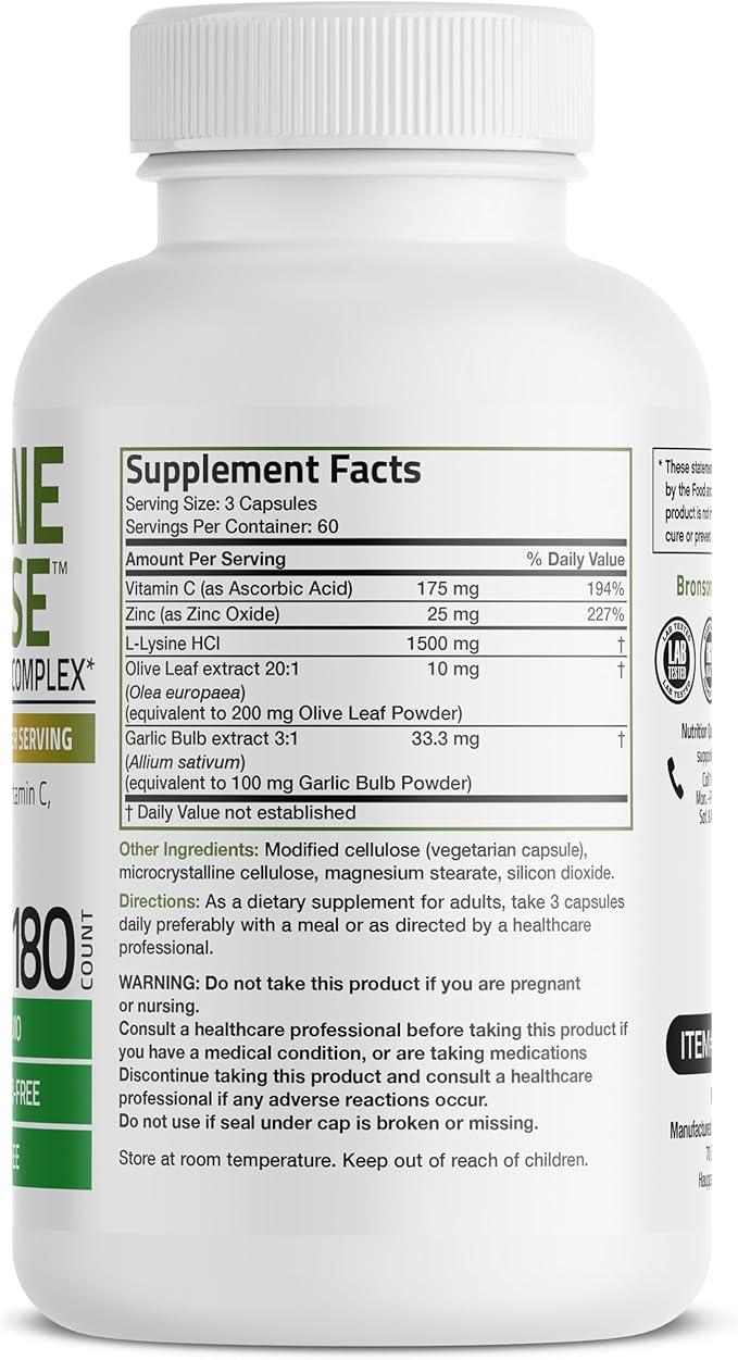 Bronson L-Lysine Defense Immune Support Complex 1500 MG L-Lysine Plus Olive Leaf, Garlic, Vitamin C and Zinc - Non-GMO, 180 Vegetarian Capsules