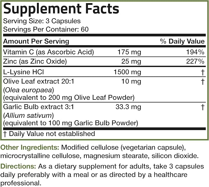 - Plus Olive Leaf, Garlic, Vitamin C & Zinc: L-Lysine combined with key additional immune support ingredients for superior coverage. Combining natural herbal ingredients, such as Olive Leaf and Garlic, which have been used throughout history in various cultures to support immune health.* Additionally includes Vitamin C and Zinc to help replenish the body with essential nutrients to help maintain a healthy immune system.*
