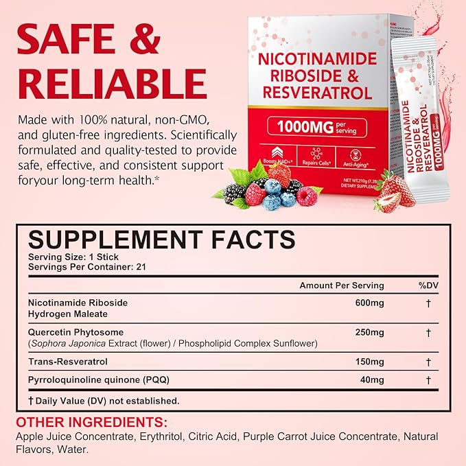 1000MG High-Pontency Liposomal NAD+ Liquid Supplement with Resveratrol & Quercetin, High Purity-Supports Cellular Longevity, Anti-Aging, Energy Metabolism | 21 Packets