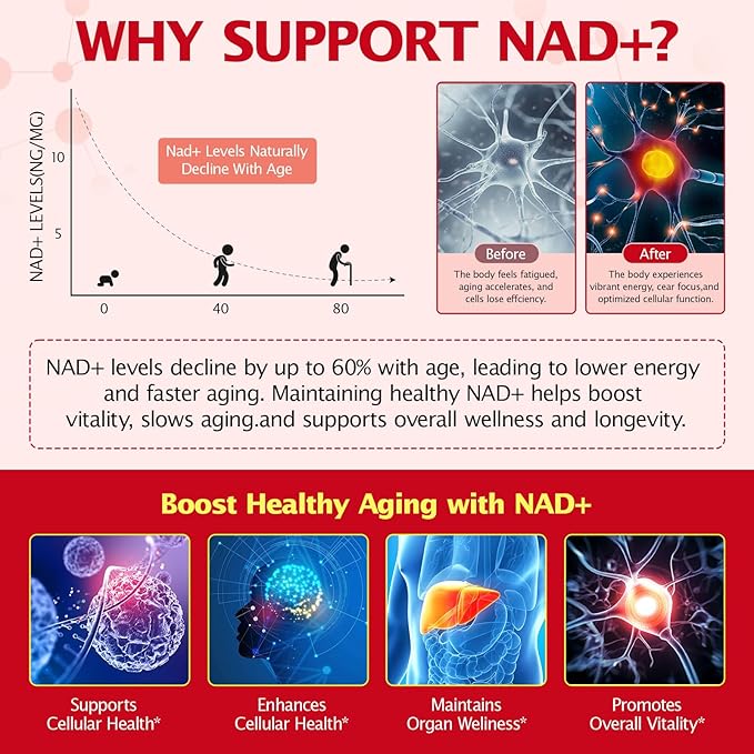 - 【Gain Youth Back】The nicotinamide level is declining as aging while NAD is essential for cellular health. Keeping nicotinamide level unlocks your body's true vitality and reveals a radiant complexion by boosting cellular longevity, metabolism and cell regeneration, and making you full of energy.