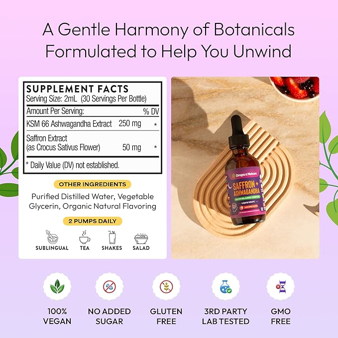 - Relaxation and Calm Support: Our liquid drops blend herbal supplements KSM66 ashwagandha & saffron extract in a fast-absorbing formula; helps promote serenity & composure during daily pressures; easier to take than ashwagandha capsules or saffron gummies