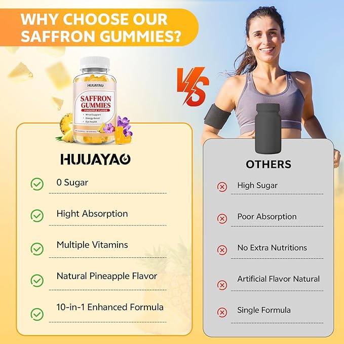 - Natural Pineapple Flavor: Saffron gummies supplement features a natural pineapple flavor, offering a tasty and enjoyable way to take your daily supplements. Unlike hard-to-swallow pills or powders, these calcium gummies are non-sticky, non-bitter