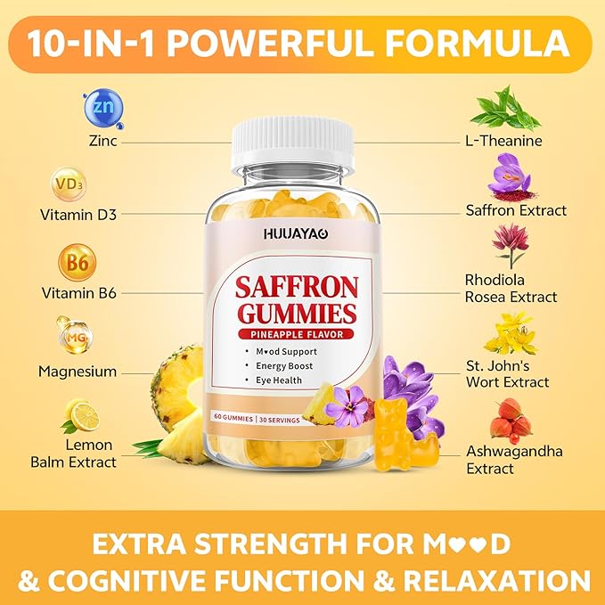 - Natural Formula: 10-IN-1 Saffron Gummies with a powerful blend of Saffron, Ashwagandha, L-Theanine, Rhodiola, St. John's Wort, Lemon Balm, and essential vitamins and minerals like Vitamin D3, B6, Magnesium, and Zinc. These ingredients work synergistically to provide your body with all-around nourishment and support