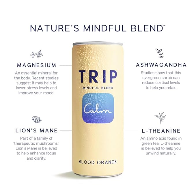 - REFRESHING LIGHTLY SPARKLING BOTANICAL DRINK: Experience a refreshingly sophisticated sparkling drink made with a blend of carefully selected botanicals, including Lion's Mane, Ashwagandha, and L-theanine. Perfectly balanced to offer a unique flavor profile, TRIP is sociable and can be enjoyed anytime, solo or mixed into cocktails!