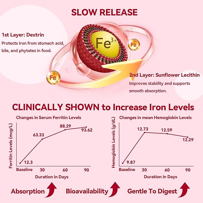 - 【Gentle & Stomach-Friendly】Formulated with 0.3μm micronized iron using patented SunActive and slow release iron technology, delivering up to 12 hours of gradual absorption in the small intestine. Designed to minimize side effects like nausea or constipation and improve absorption—up to 8.8× better than standard ferrous sulfate or ferrous gluconate. Perfect for those looking for iron bisglycinate, ferrous bisglycinate iron supplement, or gentle iron with better tolerability