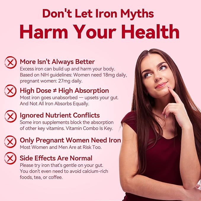 - 【Precision Dosage Iron】According to the NIH (National Institutes of Health), women need iron 18mg daily, and 27mg during pregnancy. Since excess iron isn’t easily excreted, over-supplementation may lead to buildup—potentially causing constipation, stomach cramps, liver damage, or hormonal imbalance. Gynable offers a precise iron 18 mg tablets dose—ideal for long-term use, whether as a prenatal vitamins with iron or a natural iron supplement for women