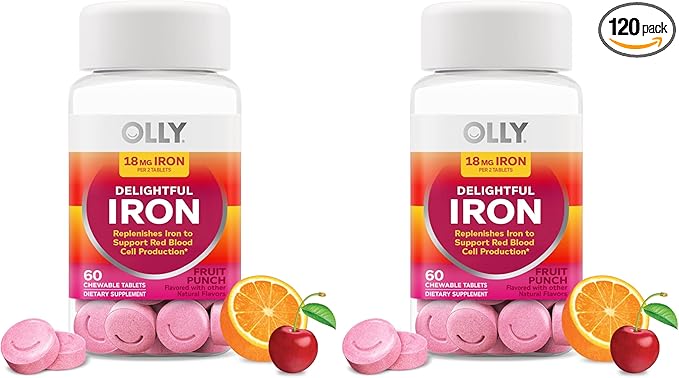 OLLY Delightful Iron Chewable Tablet, Iron Supplement from AB Fortis, Fruit Punch Flavor, 30 or 20 Day Supply - 60 Count (Pack of 2)
