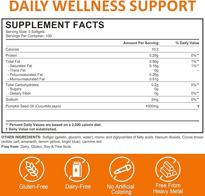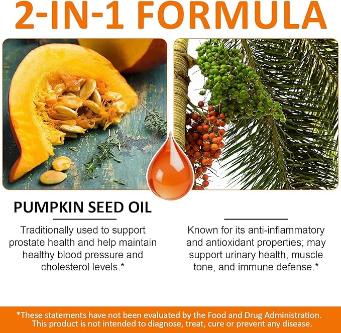 - Dual natural formula, precisely caring for prostate health: Cold-pressed extraction **1000mg pumpkin seed oil + Saw Palmetto concentrated essence (4:1 extraction), scientifically proportioned and synergistic, helps maintain normal prostate function, alleviates frequent urination and urgent urination problems, and promotes the health of the male urinary system.