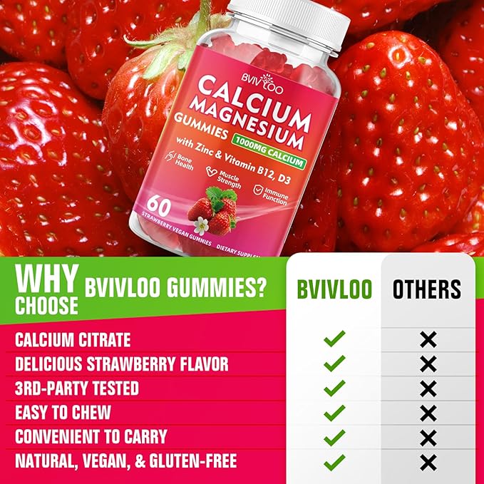 - Bone Strength & Density : Each gummy is packed with 1000mg of Calcium Citrate, a highly bioavailable form of calcium that's easily absorbed by your body. Paired with Vitamin D3, which enhances calcium absorption and utilization, and Vitamin K2, which directs calcium to where it's needed most in your bones, these gummies work synergistically to strengthen your skeletal system.