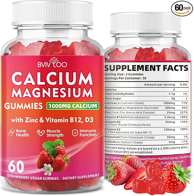 Calcium Gummies 1000mg with Vitamin D3 K2 & B Complex, Potassium, Calcium Magnesium Zinc Gummies for Bone, Muscle, Mood and Immunity - Vegan, Non-GMO, Strawberry Flavor 60 Count