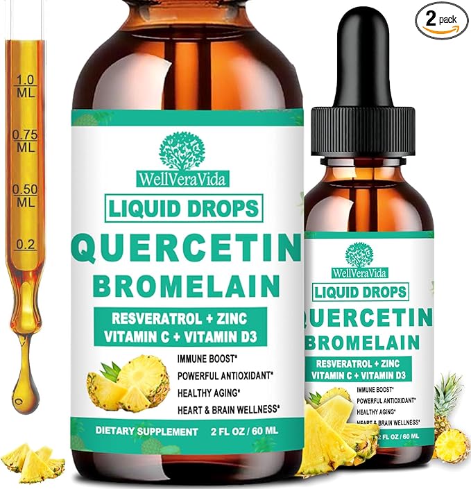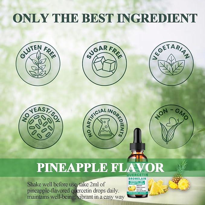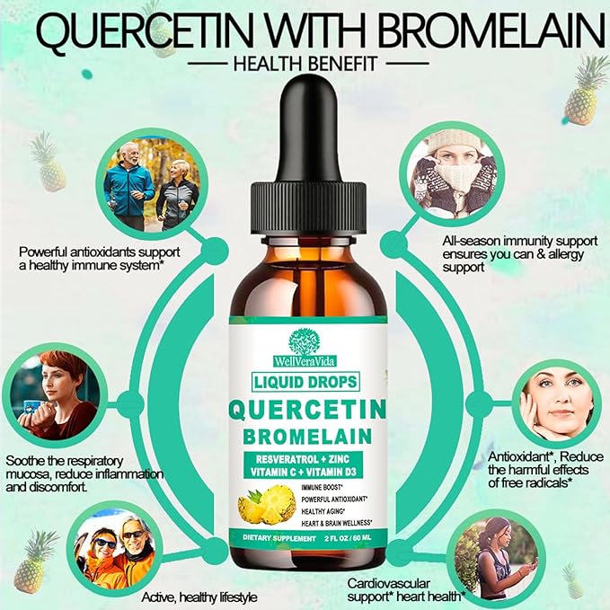 - ORGANIC QUERCETIN WITH BROMELAIN: Ouercetin with vitamin c and zinc supplement for both adults and kids.The Quercetin liquid drops contains 1000 mg natural Quercetin and 500 mg Bromelain. Quercetin, a flavonoid for your body's natural defenses, immune system support, and powerful antioxidant. And Bromelain derived from pineapple, exhibits enzymatic action for digest health and revitalizes energy levels. Together, these two natural remedy synergistic to safeguard your health, provide a constant source of energy and immune health*