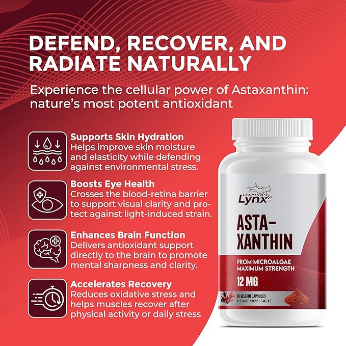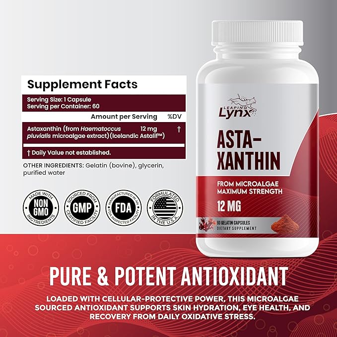 - ✅ Maximum Strength Astaxanthin 12mg – Each Astaxanthin capsule delivers a high-potency 12mg dose of Astaxanthin from Icelandic Haematococcus pluvialis microalgae, known for its superior antioxidant properties.
