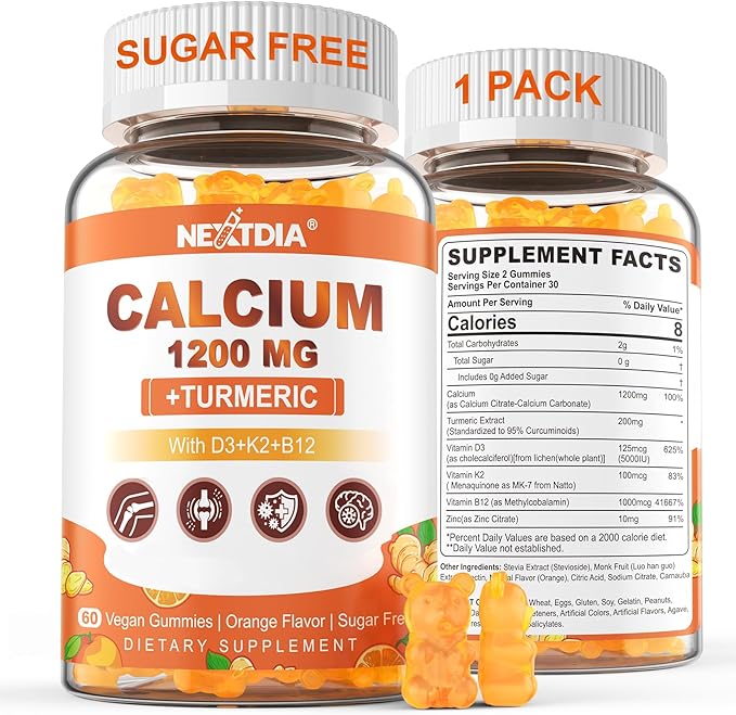Calcium 1200 mg with Vitamin D3 Gummies - Calcium + Turmeric Supplement for Women and Men with Vitamin K2 B12 - Support Bone & Muscle - Sugar Free - Vegan (60 Count)